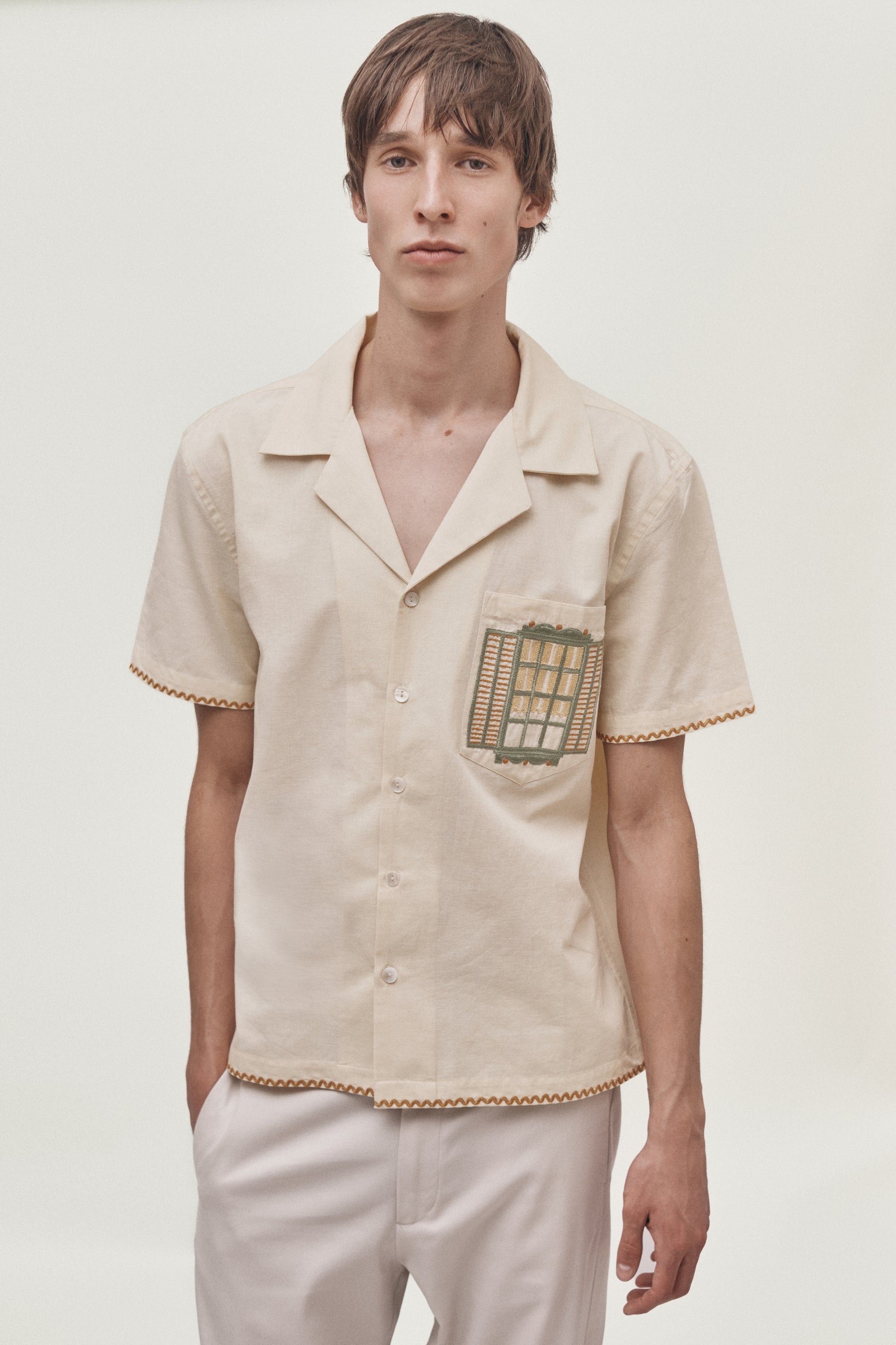 This short-sleeve shirt features intricate hand embroidered elements - an artful expression of craftsmanship. The hemp-cotton blend lends natural structure and form to the tailored silhouette, while remaining breathable and soft on the skin
